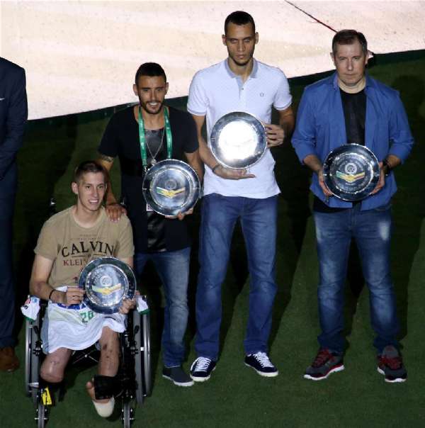1月25日,在空難中幸存的沙佩科恩斯隊球員內(nèi)托(右二)、魯舍爾(左二)、守門員福爾曼(左一)和隨行記者亨齊爾手捧義賽紀念盤合影。當(dāng)日,在巴西里約熱內(nèi)盧阿維蘭熱體育場舉行的一場足球義賽中,巴西隊以1比0戰(zhàn)勝哥倫比亞隊。本場比賽的全部收入將捐贈給沙佩科恩斯足球俱樂部。新華社記者李明攝