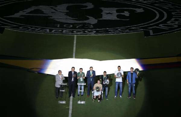 1月25日,在空難中幸存的沙佩科恩斯隊球員內(nèi)托(右二)、魯舍爾(右三)、守門員福爾曼(右四)、隨行記者亨齊爾(右一)手捧義賽紀念盤和嘉賓合影。當(dāng)日,在巴西里約熱內(nèi)盧阿維蘭熱體育場舉行的一場足球義賽中,巴西隊以1比0戰(zhàn)勝哥倫比亞隊。本場比賽的全部收入將捐贈給沙佩科恩斯足球俱樂部。新華社記者李明攝