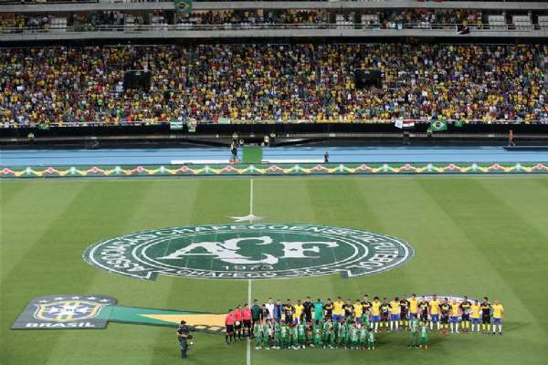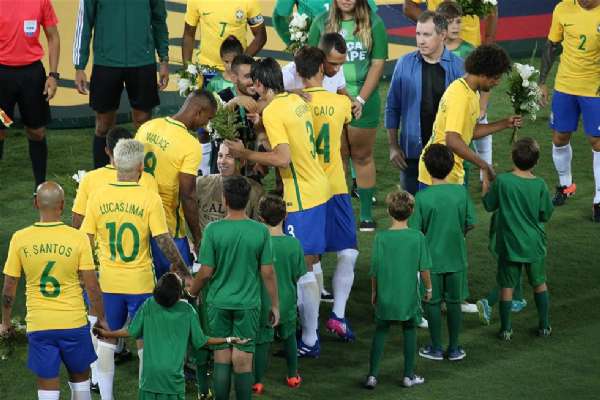 1月25日,巴西隊球員賽前向在空難中幸存的沙佩科恩斯隊球員內(nèi)托、魯舍爾和守門員福爾曼致意。當(dāng)日,在巴西里約熱內(nèi)盧阿維蘭熱體育場舉行的一場足球義賽中,巴西隊以1比0戰(zhàn)勝哥倫比亞隊。本場比賽的全部收入將捐贈給沙佩科恩斯足球俱樂部。新華社記者李明攝
