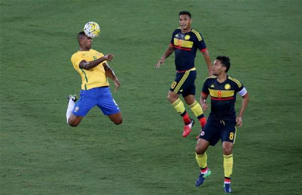 1月25日,巴西隊球員華萊士(左)在比賽中爭頂。當(dāng)日,在巴西里約熱內(nèi)盧阿維蘭熱體育場舉行的一場足球義賽中,巴西隊以1比0戰(zhàn)勝哥倫比亞隊。本場比賽的全部收入將捐贈給沙佩科恩斯足球俱樂部。新華社記者李明攝