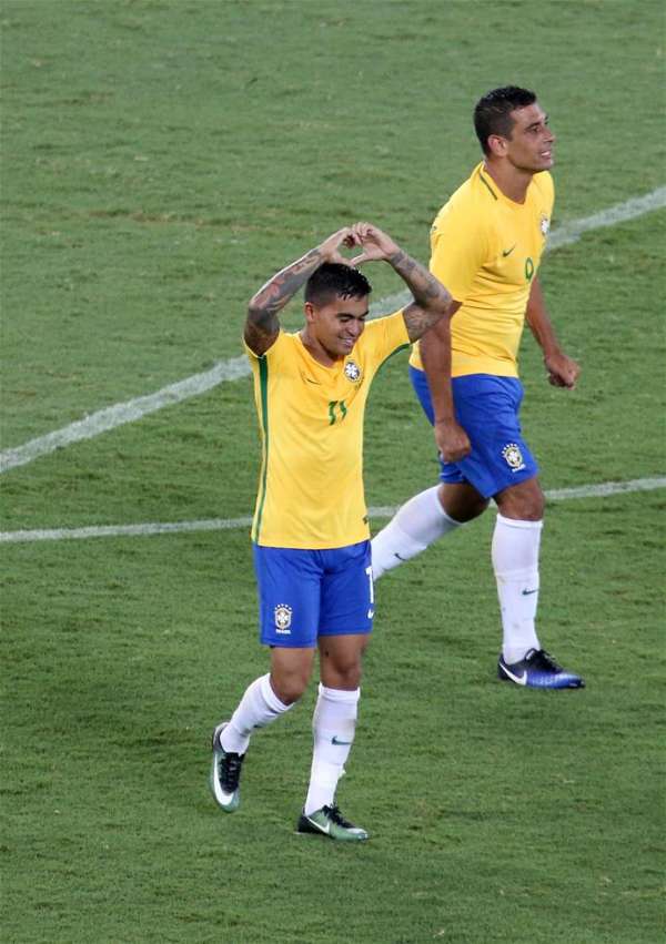 1月25日,巴西隊球員杜杜(左)在比賽中慶祝進球。當(dāng)日,在巴西里約熱內(nèi)盧阿維蘭熱體育場舉行的一場足球義賽中,巴西隊以1比0戰(zhàn)勝哥倫比亞隊。本場比賽的全部收入將捐贈給沙佩科恩斯足球俱樂部。新華社記者李明攝