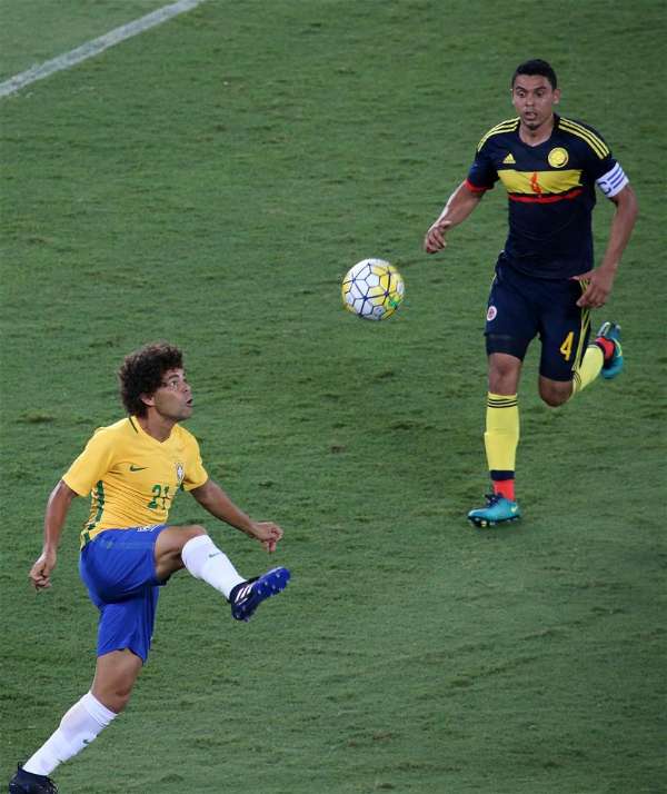 1月25日,巴西隊球員卡米洛(左)在比賽中拼搶。當(dāng)日,在巴西里約熱內(nèi)盧阿維蘭熱體育場舉行的一場足球義賽中,巴西隊以1比0戰(zhàn)勝哥倫比亞隊。本場比賽的全部收入將捐贈給沙佩科恩斯足球俱樂部。新華社記者李明攝