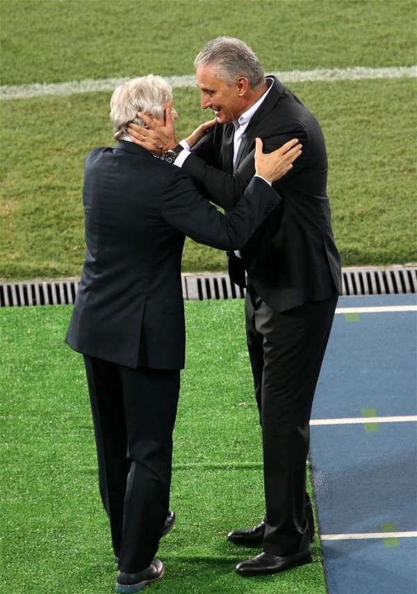 1月25日,巴西隊主教練蒂特(右)與哥倫比亞隊主教練佩克爾曼在賽后互相致意。當(dāng)日,在巴西里約熱內(nèi)盧阿維蘭熱體育場舉行的一場足球義賽中,巴西隊以1比0戰(zhàn)勝哥倫比亞隊。本場比賽的全部收入將捐贈給沙佩科恩斯足球俱樂部。新華社記者李明攝