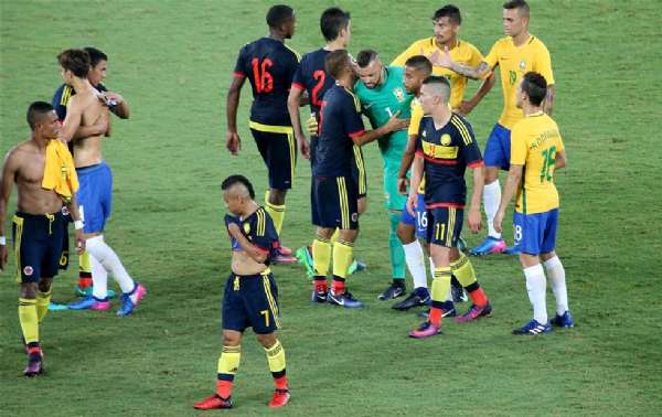 1月25日,雙方球員在賽后互相致意。當(dāng)日,在巴西里約熱內(nèi)盧阿維蘭熱體育場舉行的一場足球義賽中,巴西隊以1比0戰(zhàn)勝哥倫比亞隊。本場比賽的全部收入將捐贈給沙佩科恩斯足球俱樂部。新華社記者李明攝