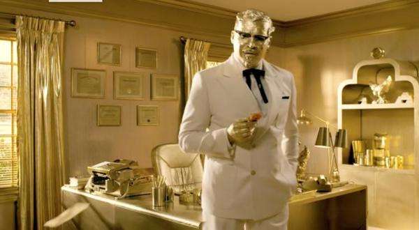 去年肯德基針對脆皮炸雞推出了一系列宣傳活動,那時候 George Hamilton 還是山德士上校,小麥色皮膚襯托得他看起來也脆脆的。這次 Billy Zane 全身的金色涂料也和這款新炸雞產品的特色挺吻合,而且 Billy Zane 總扮演一些富家公子哥,熒幕氣質和這款炸雞的關鍵詞 Gold 還能扯上那么點關系。