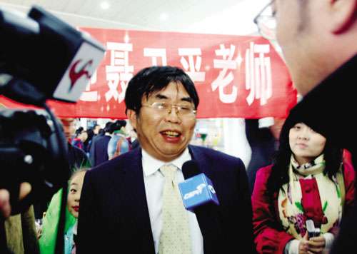 中午13時(shí)50分,聶衛(wèi)平走出了接機(jī)口,他身著黑色西裝,系一條醒目的黃色領(lǐng)帶,行裝很輕便?吹铰櫺l(wèi)平,兩個孩子率先沖了過去!奥櫪蠋熀!”丁心怡小朋友大聲地說,聶衛(wèi)平很高興,“好好好!謝謝你們!”