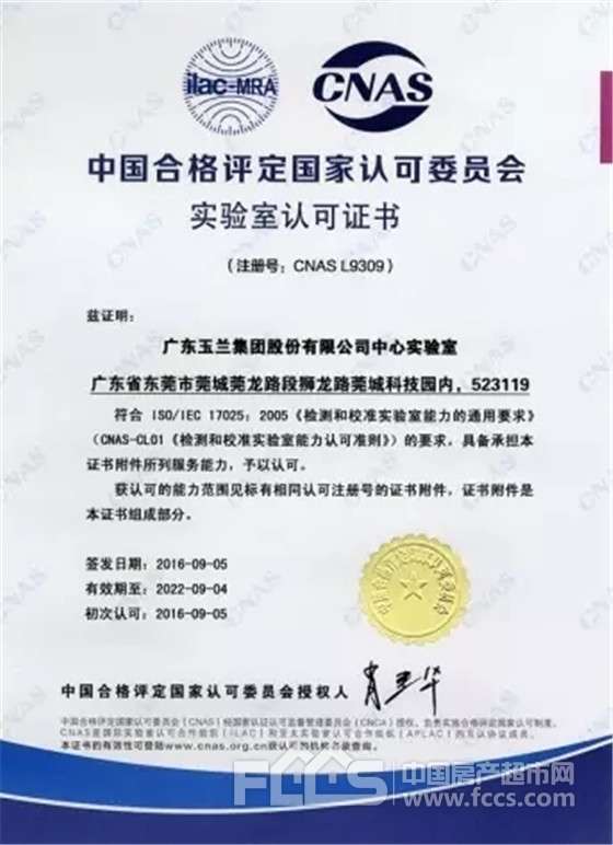 2016年9月5日,廣東玉蘭集團(tuán)股份有限公司中心實(shí)驗(yàn)室通過CNAS的層層嚴(yán)格評(píng)審,獲得CNAS實(shí)驗(yàn)室認(rèn)可證書,成為我國首 家通過CNAS認(rèn)可的壁紙生產(chǎn)企業(yè)。這標(biāo)志著玉蘭實(shí)驗(yàn)室的建設(shè)取得重大突破,具備了按相應(yīng)認(rèn)可準(zhǔn)則開展檢測服務(wù)的技術(shù)能力,再次凸顯了玉蘭的科研實(shí)力,對(duì)玉蘭產(chǎn)品安全保障和性能的提升有非常大的促進(jìn)意義。