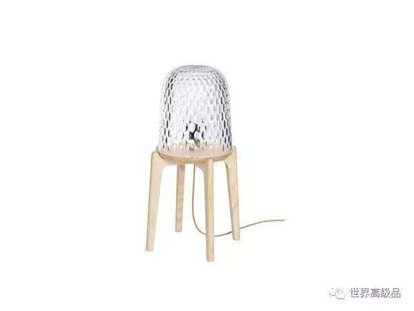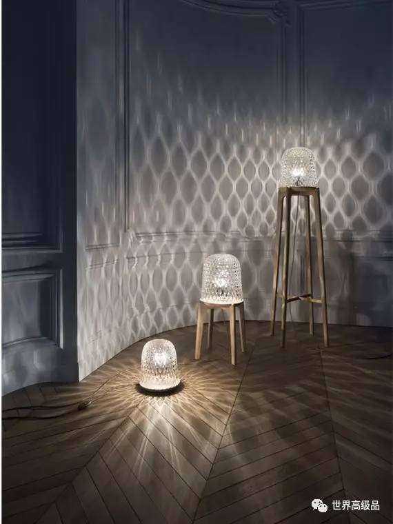 該系列由三款水晶搭配白蠟?zāi)镜臒艟呓M成。水晶部分是用斜角切割從富有幾何感的星形頂部到連接木材的底部裝飾而成,這種