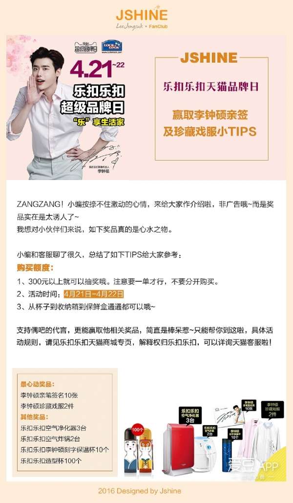 愛豆新聞訊 李鐘碩代言的品牌樂扣樂扣于4月21日-22日推出“樂扣樂扣天貓品牌日”活動,
