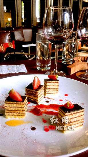 “歌劇”蛋糕。草莓、巧克力醬,奶油,戚風(fēng)蛋糕的層層重疊,別致的名字和意境,享受美食的同時(shí)仿佛與歌劇有了若有似無的隔空交流。
