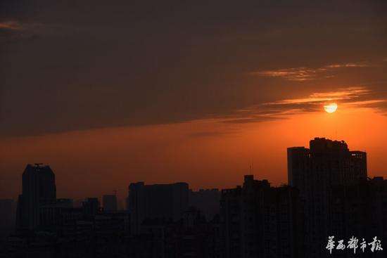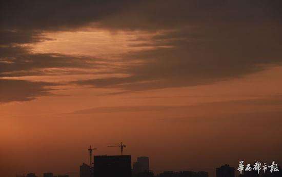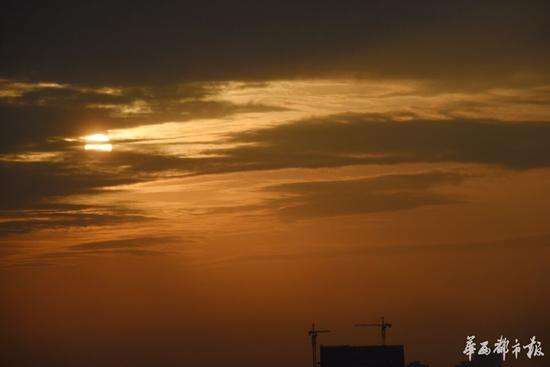 今早,一輪紅日從成都東方冉冉升起,天空出現(xiàn)了彩霞滿天,這是成都近期來難得看見的朝霞。