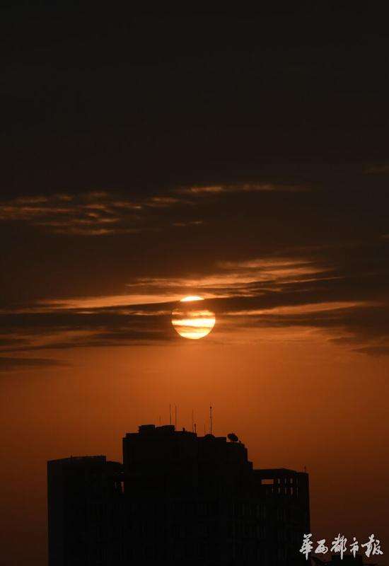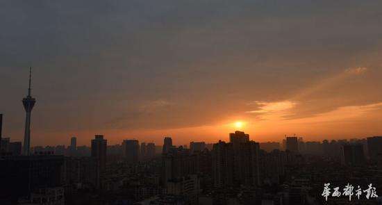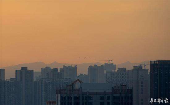 2017年2月8日清晨,老天在成都上空打開一扇天窗,窗內(nèi)朝陽可視霞光沸騰,飛鳥騰空,龍泉山脈在市區(qū)里也清晰可見,