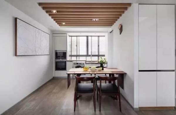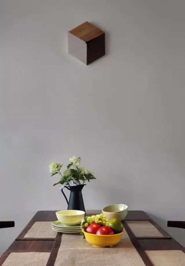 ▲餐廳沒有主燈,小巧的方形射燈藏在木質(zhì)吊頂中,別有風味,遠處的紙鶴立式燈,仿然若飛。