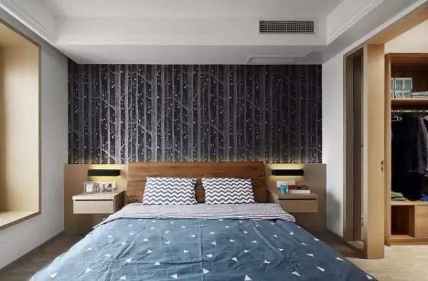 ▲床頭的木質(zhì)背板和床頭柜,是一體定制的,造型簡約別致,配合木質(zhì)雙人床,顯得臥室溫和又安靜。而黑色星光版的森林系壁紙,成為臥室的點睛之筆。