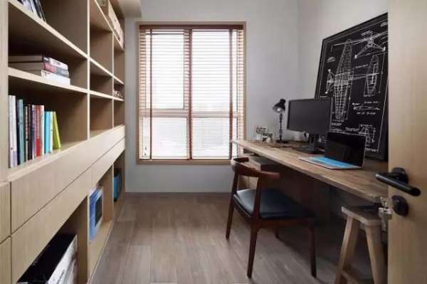 ▲一整面墻的落地書柜,考慮到實用和美觀雙重因素,業(yè)主選擇了木工現(xiàn)場制作,成品顯然也沒有讓他們失望。