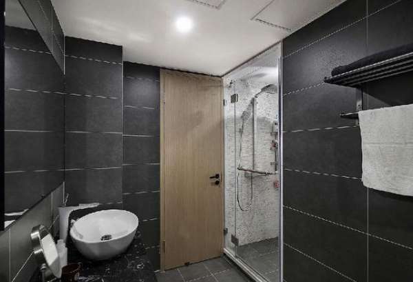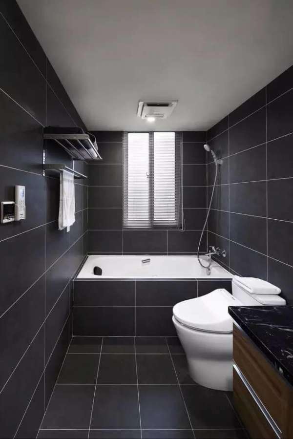 ▲深灰色又富于質(zhì)感的瓷磚,從地面貼到墻上,再到浴缸外壁。整體感非常好,配合白色潔具,簡約時尚。設計師巧妙地實現(xiàn)了浴缸和淋浴的雙重功能。