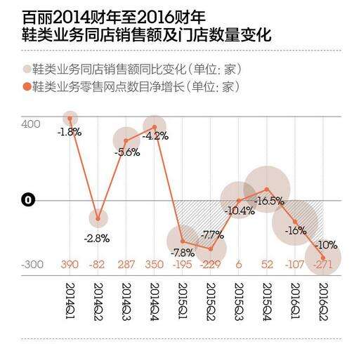 國內(nèi)另一個“鞋王”——百麗的狀況也足以讓它的管理者和投資者憂心忡忡。它同樣正在經(jīng)歷同店銷售額的每季愈下和關(guān)店。10月24日,百麗國際發(fā)布2016財年中期(2016年3月1日至2016年8月31日)業(yè)績,因同店銷售出現(xiàn)兩位數(shù)下降,百麗的鞋類業(yè)務(wù)銷售規(guī)模較去年同期下降12.7%,同時,報告期內(nèi),內(nèi)地
