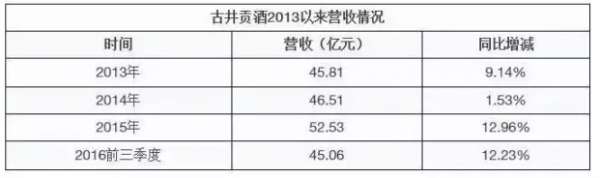 從整體來看,2013年,古井貢酒營業(yè)收入45.81億元;2014年完成46.51億元,漲幅1.53%;2015年完成52.53億元;2016年度前三季度完成45.06億元。