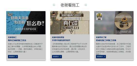 對于立邦工程的關(guān)注用戶來說,老謝這個(gè)名字簡直不能再親切。作為2016年火速走紅的人氣明星,立邦工程資深施工專家老謝對我們來說簡直不能再親切。在這個(gè)每月常見的精品專欄中,老謝深入現(xiàn)場、圖文并茂、深入淺出地為用戶帶來實(shí)用寶貴的施工建議,現(xiàn)在都已被收錄在立邦工程全新官網(wǎng)上,點(diǎn)擊“老謝看施工”,動(dòng)動(dòng)手指一鍵直達(dá)。