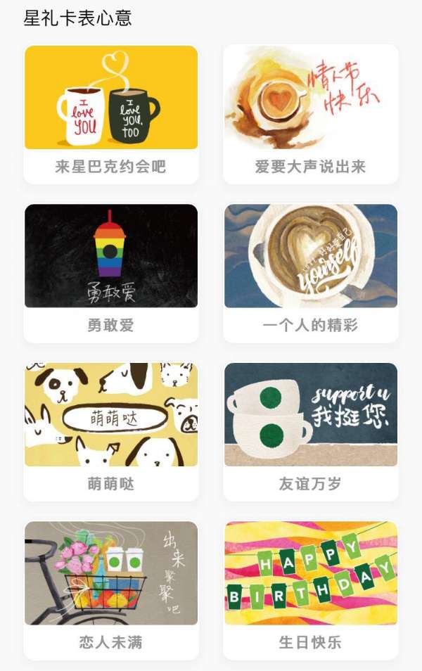 其中,“請你喝咖啡”可以選擇2種不同的咖啡品類。而“星禮卡表心意”則可以選擇8種不同面額“星你卡”。