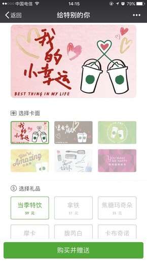 通過微信點(diǎn)單可使用不同的主題,另外在留下祝福頁(yè)面還可以添加文字等內(nèi)容,表達(dá)自己的心意。獲贈(zèng)者可通過微信卡包查看詳情,并前往星巴克門店使用,非常方便。