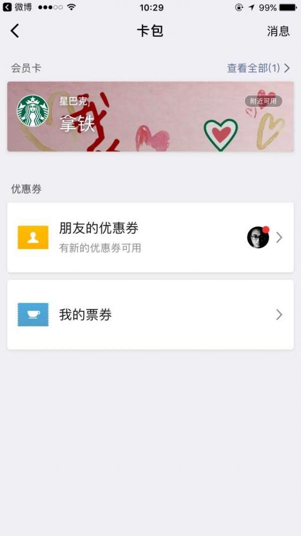 收到禮品與祝福,可以通過(guò)微信“我-卡包”入口查看并使用。如果所在位置周圍有星巴克門店,禮品卡還會(huì)在卡包里自動(dòng)置頂方便使用。