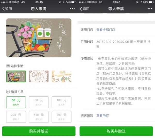 你可以在線購(gòu)買單杯咖啡兌換卡或“星禮卡”(儲(chǔ)值卡)贈(zèng)送給微信朋友,并在贈(zèng)送頁(yè)面用文字、圖片、視頻留下你對(duì)TA的專屬祝福。