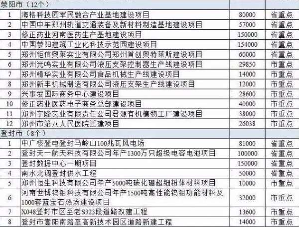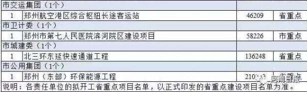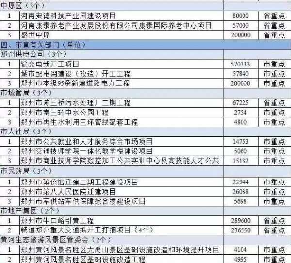 市直有關部門負責的擬開工重點項目,鄭州市本級95條新建道路電力工程、鄭州市陳三橋污水處理廠二期工程、鄭州市公共就業和人才服務綜合市場項目、鄭州市殯儀館遷建二期工程建設項目、鄭州市第八人民醫院遷建項目、鄭州市牛口峪引黃工程、暢通鄭州重大交通擬開工打捆項目(4個)、鄭州航空港區綜合樞紐長途客運站、鄭州市第七人民醫院濱河院區建設項目、北三環東延快速通道工程均在列。