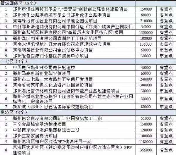 惠濟區6個,包括鄭州思念食品有限公司新工業園食品加工二期、三全食品綜合基地續建項目、中部兩岸水產海鮮果蔬物流園二期、鄭州宜家家居商場項目、鄭州惠濟區棚戶區改造PPP建設項目一期等。