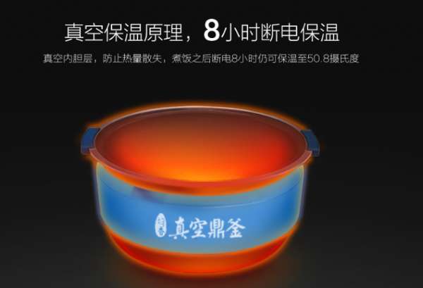 新款真空變壓IH電飯煲擁有業(yè)界首創(chuàng)真空鼎釜。真空內(nèi)膽保證強力聚能鎖熱,熱量不易流失,提高熱能的利用率。讓米飯充分熟化的同時減少能源浪費。依賴這一特性,該款電飯煲可以實現(xiàn)斷電 8 小時仍可保溫至 50.8℃的驚人效果。