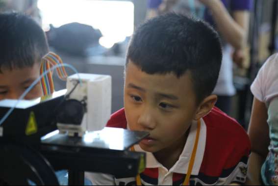孩子們在觀察3D打印機(jī)的工作過程