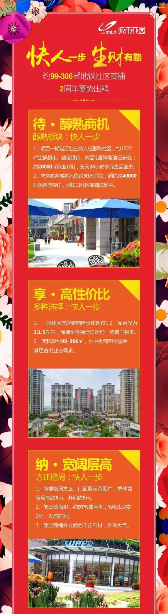 ??除了項目自身配套利好的不斷完善以外,地鐵21號線、教育城施工進度不斷進行、工信部電子五所被納入廣州東重點發(fā)展項目等利好不斷涌現(xiàn),碧桂園城市花園區(qū)位價值一再被刷新。除了直接帶旺人氣外。其擁攬的精英效應(yīng),將吸引更多的年輕新富群體集群。龐大的客流量使得項目商鋪有了更大的發(fā)展前景。其建筑面積約99-306㎡的豐富面積段讓眾多個體戶等商家有了更多元化的選擇。