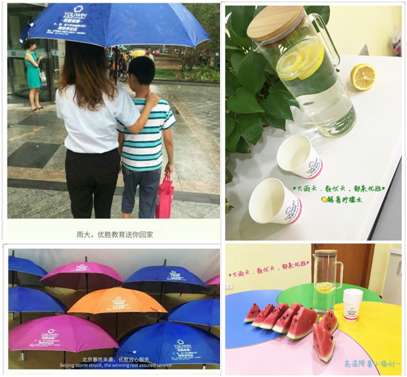 2016年6、7月份,正值全國(guó)暴雨和酷暑黃色預(yù)警期,“優(yōu)勝益+”項(xiàng)目及時(shí)啟動(dòng),全國(guó)千家校區(qū)聯(lián)動(dòng)發(fā)起“與你在益起”大型公益活動(dòng),大雨天老師街頭送傘、送學(xué)生回家,酷暑天氣無(wú)償提供避暑場(chǎng)地和解暑檸檬水等周到服務(wù),為數(shù)萬(wàn)家庭提供便利,廣受好評(píng)!