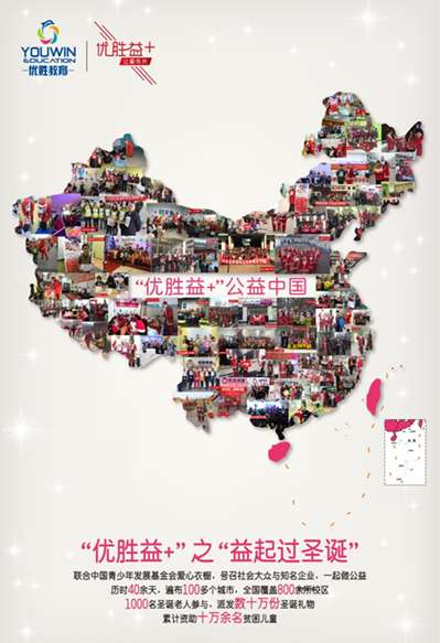 同年,優(yōu)勝教育將公益事業(yè)正式命名為“優(yōu)勝益+”,董事長(zhǎng)陳昊親自為項(xiàng)目定調(diào),旨在打造聯(lián)合社會(huì)各界力量關(guān)愛(ài)青少年的公益平臺(tái)。優(yōu)勝教育在2015年圣誕節(jié),聯(lián)合中國(guó)青少年發(fā)展基金會(huì),攜手社會(huì)知名企業(yè),組織以“送