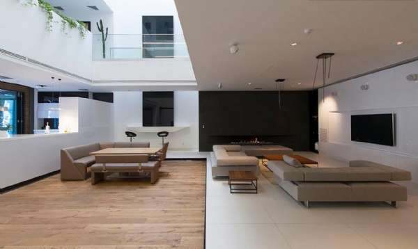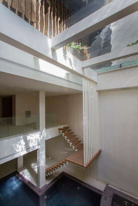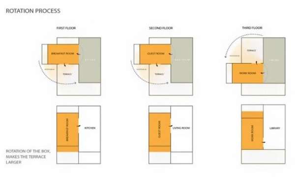 在伊朗傳統住宅中,基于季節的變化,許多住宅中客廳分為夏季和冬季兩個 ,以適應不同的季節。而設計師在這幢住宅中帶來的創新設計正是呼應并借鑒于這一傳統形式,因為 Sharifi-ha House 自二層以上的三個房間可以使用遙控器向外旋轉九十度,所以業主可以根據隱心情 、天氣、季節、隱私需要,隨時調整房間的窗戶朝向 ,以獲得最佳的采光、甚至擴展住宅空間。居民在兩層地下室空間里穿行,停車場分布在一樓,兩層為公共活動空間,三層和四層是私人生活空間。