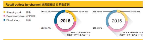 截止2016年12月31日,已在中國(guó)內(nèi)地超過300個(gè)城市擁有899間零售店鋪,其中超76%
