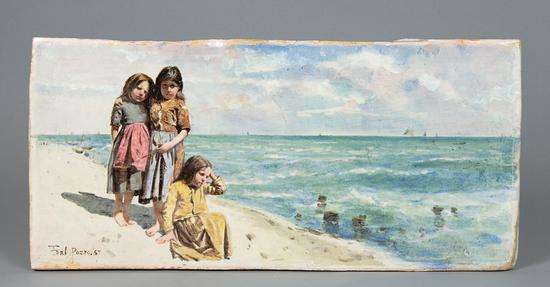 流浪的小女孩 托馬索?達(dá)爾波佐(1862~1906) 法恩扎 1887年 錫釉陶陶板 高19.5厘米、長(zhǎng)40厘米、厚1.9厘米