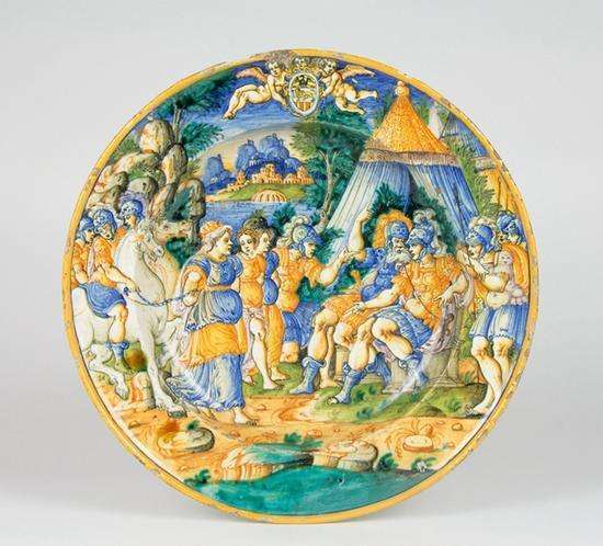亞歷山大大帝前的達(dá)里奧家族紋章盤(pán) 焦萬(wàn)?巴蒂斯塔?達(dá)列?怕列(現(xiàn)有資料1560年~1573年) 維羅納 1563年1月15日 錫釉陶 高5.5cm、直徑39cm
