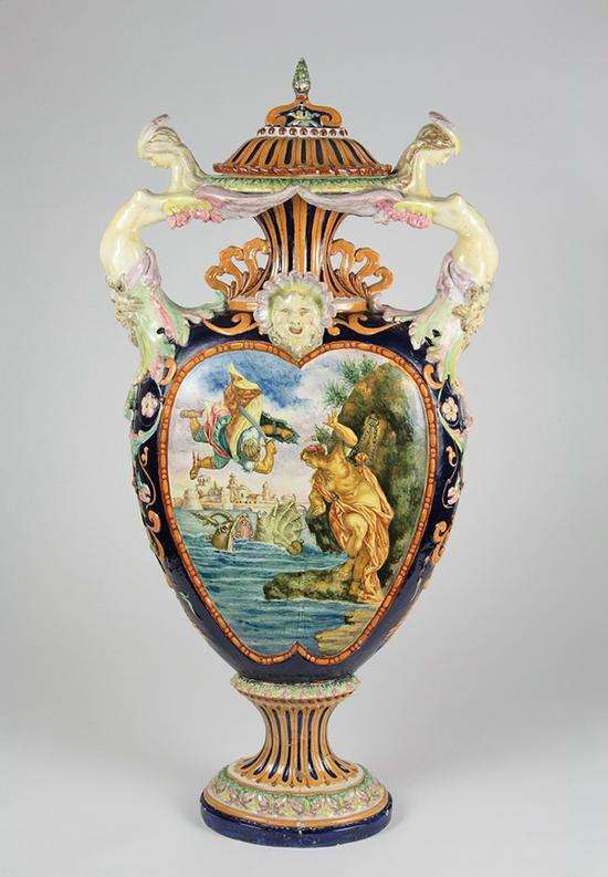繪有“珀?duì)栃匏购桶驳侣迥_(dá)”的雙耳瓶 法恩扎、米納爾迪兄弟工坊 19世紀(jì)末 錫釉陶 通高102厘米、通寬50.5厘米、腹徑21厘米