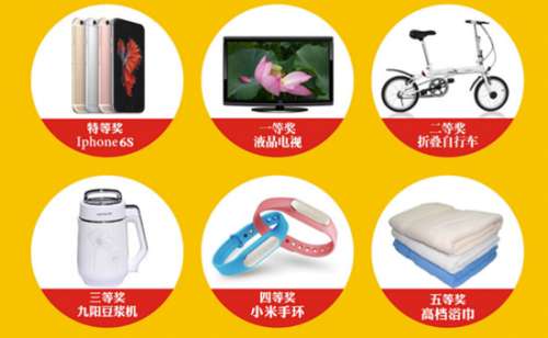 該活動(dòng)設(shè)一等獎(jiǎng)3名,獎(jiǎng)品為價(jià)值3000元液晶電視,5名二等獎(jiǎng)均可獲得價(jià)值880元的折疊自行車(chē),20名三等獎(jiǎng)將獲價(jià)值499元九陽(yáng)豆?jié){機(jī),30個(gè)小米手環(huán)成為四等獎(jiǎng)得主的囊中之物,100名五等獎(jiǎng)將分別獲得德維爾提供的高檔浴巾。而價(jià)值5288元的特等獎(jiǎng)iPhone6s是否會(huì)花落你家?只有參與了才知道。