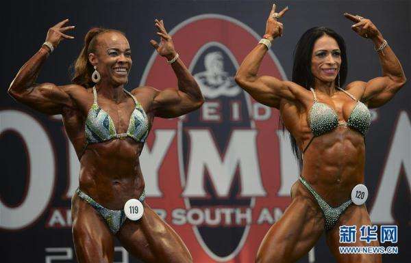 2月18日,在哥倫比亞的麥德林,兩名女選手參加南美奧林匹亞業(yè)余健美比賽。 新華社/法新