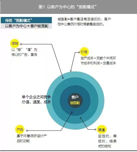 首先,我的研究發(fā)現(xiàn),針對企業(yè)來說,“以客戶為中心”的內(nèi)涵和方法,在傳統(tǒng)商業(yè)與虛實(shí)交錯(cuò)的商業(yè)世界,有本質(zhì)區(qū)別。前者是對客戶的“圍剿模式”管理,后者則是“求愛模式”的管理。