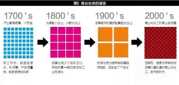 商業(yè)體系的形成經(jīng)歷了幾百年的進(jìn)化,最初是小而全的時(shí)代,工匠作坊作為一個(gè)產(chǎn)業(yè)階層,專注于個(gè)體間競爭。到20世紀(jì)的大批量規(guī)模化生產(chǎn)時(shí)代,企業(yè)基于價(jià)值鏈競爭。隨著21世紀(jì)專業(yè)化分工、跨界整合時(shí)代的到來,形成了連接企業(yè)利益相關(guān)者的商業(yè)生態(tài)圈(見圖5)