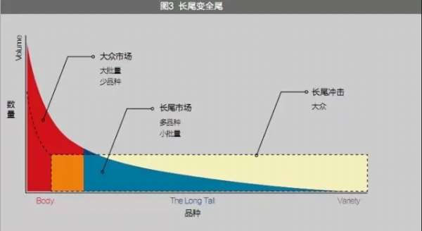 在網(wǎng)絡(luò)世界有一個(gè)現(xiàn)象,那些少數(shù)熱銷的大眾產(chǎn)品和眾多冷門的小眾產(chǎn)品,其市場份額呈現(xiàn)出一條帶有長長尾巴的曲線。當(dāng)把尾巴的所有冷門市場匯集起來,其市場能量可以超過大眾產(chǎn)品的市場能量。這就是長尾理論(見圖3)。