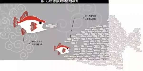 過去那些一萬人一款的單品類大企業(yè),就像一條孤獨(dú)的大魚,正在被數(shù)千百萬的個(gè)性化利基市場的小魚群淹沒(見圖4)。