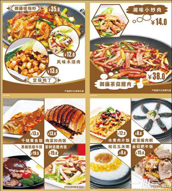 套餐系列: 招牌回鍋肉飯,水煮肉片飯,黃金雞排飯,風味木須肉飯,宮保雞丁飯,金菇肥牛飯,湘味小炒肉飯,茶樹菇臘肉飯,耙牛肉飯 ,豆腐黃魚飯,梅菜扣肉飯 ,泡椒牛肉絲飯,鮮椒仔雞飯,桂花什錦炒飯,碎米芽菜雞拌飯,臺式鹵肉拌飯,快捷搭配A餐,快捷搭配B餐.
