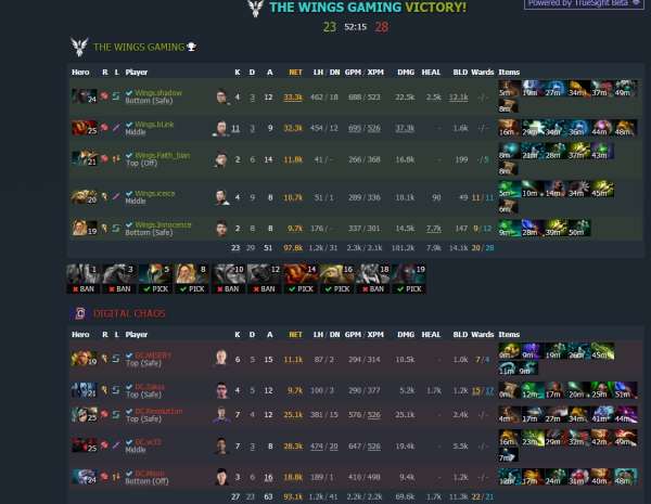最終DC在被推掉3路高地后只能孤注一擲,死亡沖鋒,但面對Wings成名的團隊拉扯和執行力以及跳刀跳刀幾乎無解的滿級卡爾最終只能無奈打出GG。