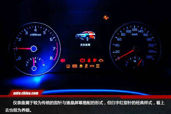 儀表盤屬于較為傳統(tǒng)的指針與液晶屏幕搭配的形式,但白字紅指針的經(jīng)典樣式,看上去也較為養(yǎng)眼。