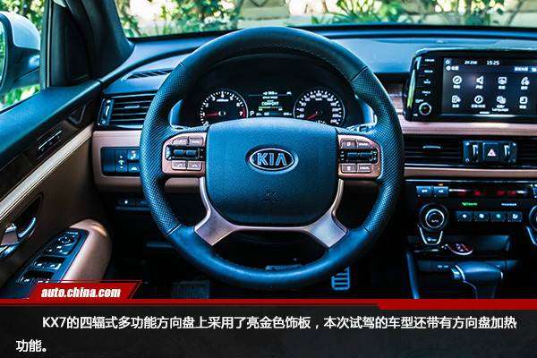 KX7的四輻式多功能方向盤上采用了亮金色飾板,本次試駕的車型還帶有方向盤加熱功能。