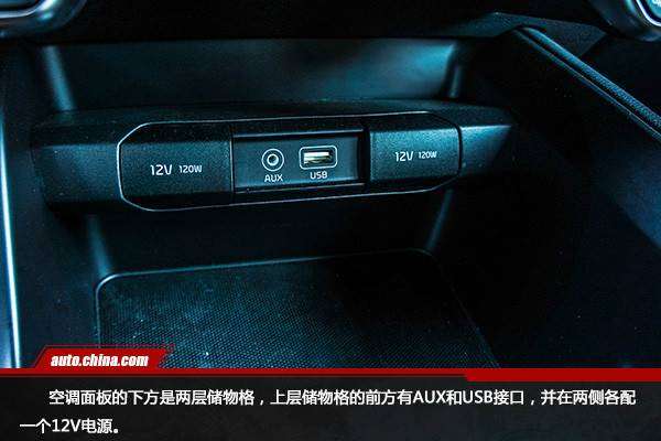 空調(diào)面板的下方是兩層儲(chǔ)物格,上層儲(chǔ)物格的前方有AUX和USB接口,并在兩側(cè)各配一個(gè)12V電源。